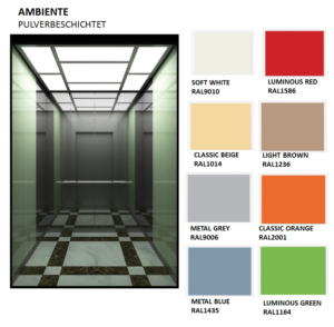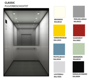 Walls: Rigid car panel construction made of powder-coated sheet metal in RAL colors according to the “Colour Design Collection”.