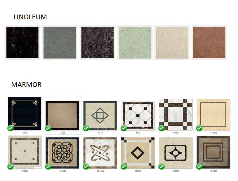 Floor: linoleum. Further variants are available according to “Accessories for floor coverings”.