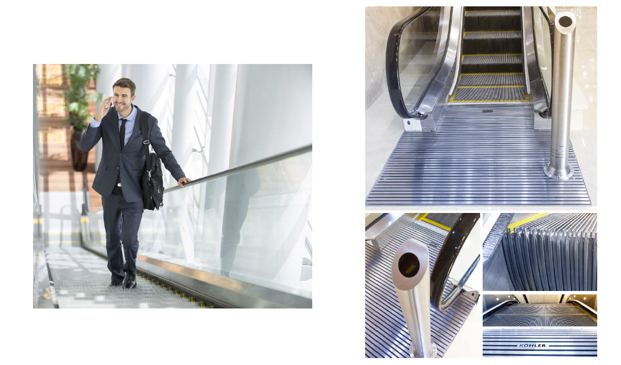 Hospitals, shopping centers, metro stations, office buildings or airports – we offer the right escalators and passenger conveyor belts for your usage requirements for normal or high numbers of people with up to 24 hours of use per day. With a wide variety of designs, the escalator blends into any environment. Various stainless steel surfaces with modifiable lighting colors (RGB) can be selected. Clear visual guidance of passengers with stylish direction indicators, lighting of steps and ridges, as well as a number of safety devices and sensor systems ensure safe operation.