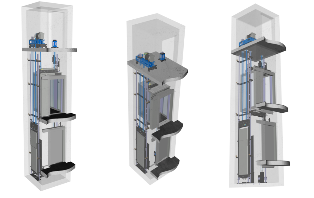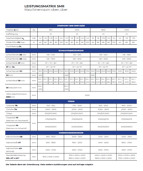 SYMPHONY SMR is an electric traction elevator with high ride comfort and low noise emissions. The gearless drive together with the regulation and control unit are housed in a small machine room above the shaft.